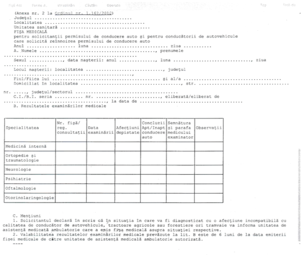 La o clinică acreditată, pe cont propriu sau intermediat de școala de șoferi. Constă în controale la câțiva medici specialiști, care parafează o fișă – medicină internă, ortopedie, neurologie, psihiatrie, oftalmologie, O.R.L. Poate dura o oră, două. Arată așa: