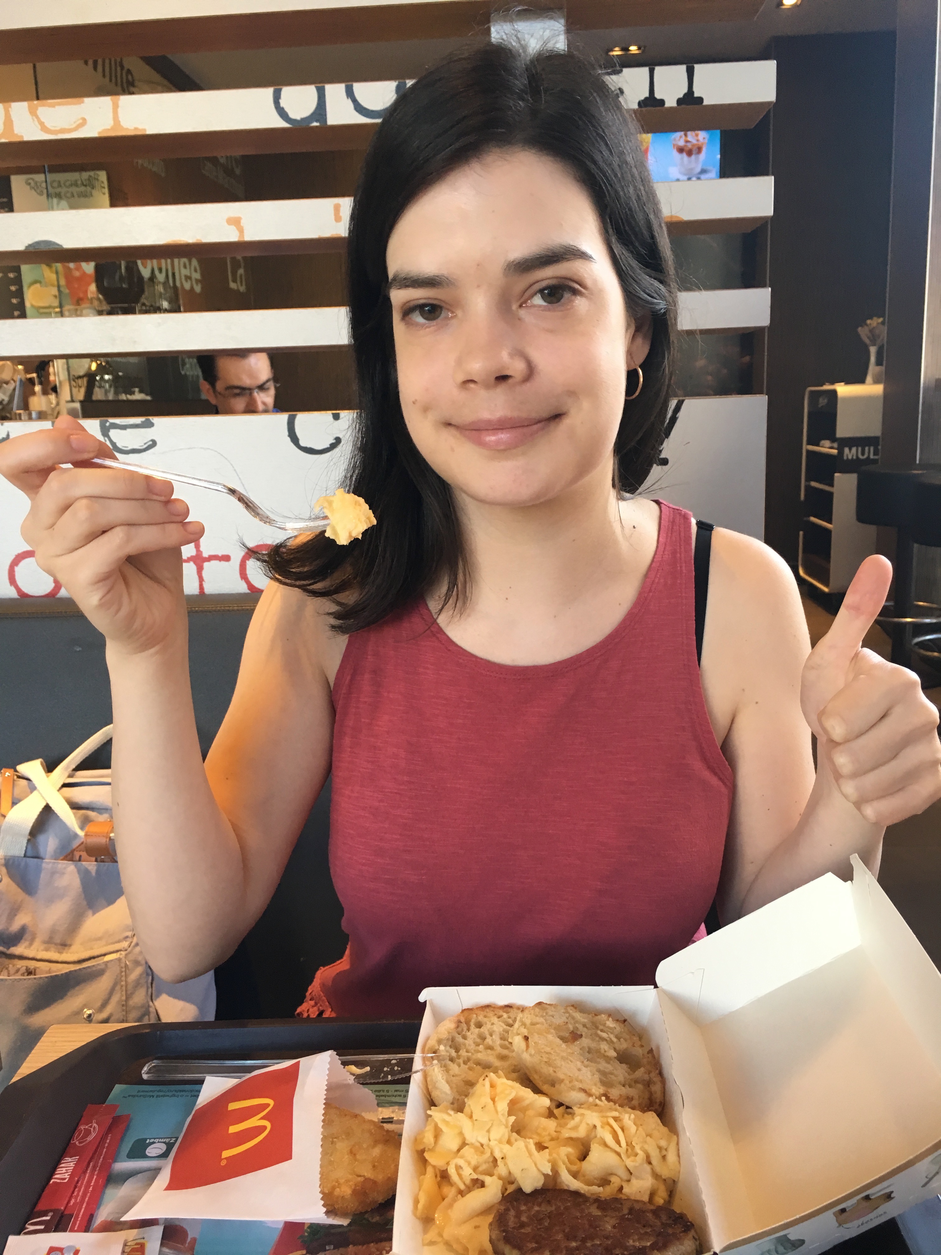Aici sunt eu luând prima mea masă solidă după patru săptămâni, la opt dimineața! Nu m-a dus așa mult capul și am mers la McDonalds să mănânc ouă de plastic. După o oră m-a durut groaznic stomacul.