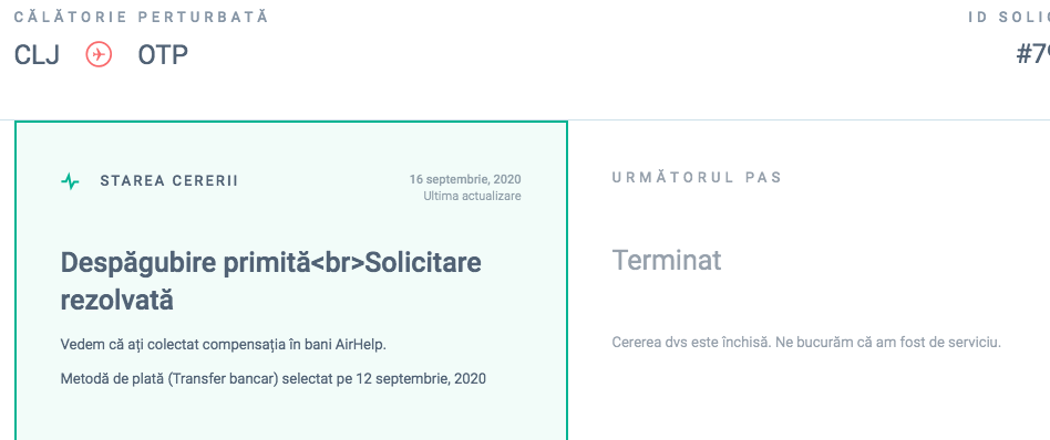 Răbdarea ta a fost răsplătită. Vei primi despăgubiri pentru călătoria ta întreruptă. Vei primi în curând un mesaj pentru a afla care este cea mai bună modalitate de a-ți transfera banii.