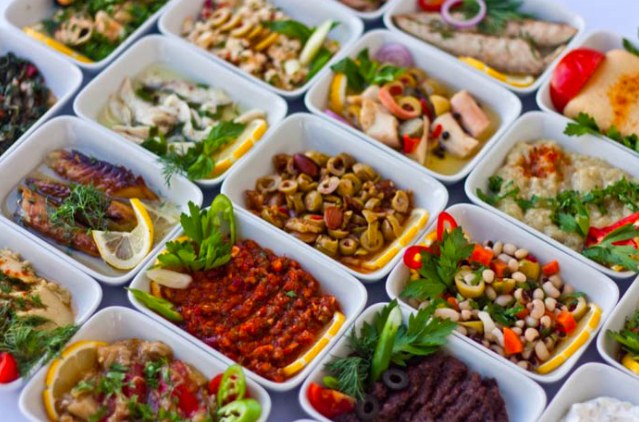 Meze – un mix de aperitive, unele gătite, unele crude. Iaurt, măsline, vinete, etc.