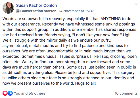 Traducere: “Cuvintele sunt atât de puternice în perioada recuperării, mai ales dacă au legătură cu înfățișarea noastră. (…) Toți ne străduim zilnic să acceptăm fața inflamată, asimetrică, gura plină de metal și încercăm să găsim înțelegere și bunătate pentru noi înșine. Ne simțim de multe ori inconfortabil sau avem dureri mai mult timp decât ne-am așteptat. Uneori suntem luați prin surprindere de sâsâieli, salivă, ocluzii deschise, etc. Încercăm să găsim puterea interioară pentru a merge mai departe, iar unele zile sunt mult mai grele decât altele. În unele zile, să fii văzut în public este ceva foarte dificil. Te rog, fii bun și suportiv. Operația asta nu este ca altele, având în vedere că fața noastră este atât de atașată de identitatea noastră și de cum ne prezentăm lumii. (..)”